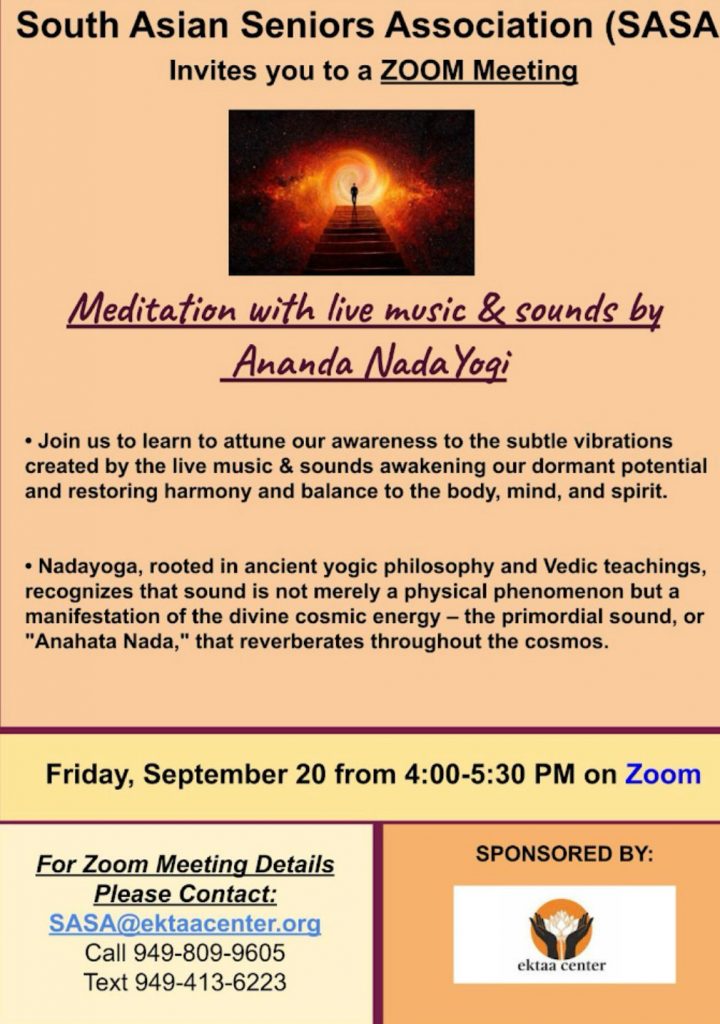 Naad Samyama Initiation event was followed by a second wonderful “Meditative Live Music and Sounds” zoom event on September 20, 2024, introduced to & put together by Preeti Singh for SASA Ektaa center.